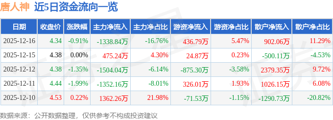 12月16日的资金流向数据方面,主力资金净流出1338.84万元,占总成交额16.76%,游资资金净流入436.79万元,占总成交额5.47%,散户资金净流入902.06万元,占总成交额11.29%。
