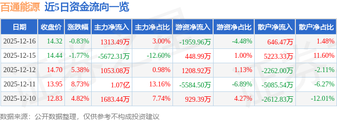 证券之星消息,截至2025年12月16日收盘,百通能源(001376)报收于14.32元,下跌0.83%,换手率13.92%,成交量29.75万手,成交额4.37亿元。
