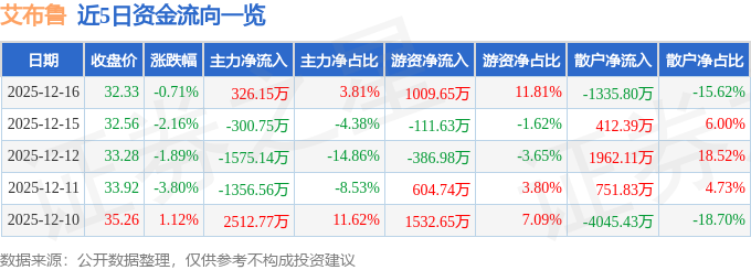 证券之星消息,截至2025年12月16日收盘,艾布鲁(301259)报收于32.33元,下跌0.71%,换手率2.64%,成交量2.61万手,成交额8549.83万元。