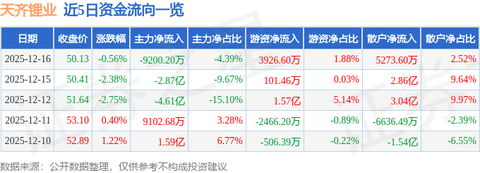 证券之星消息,截至2025年12月16日收盘,天齐锂业(002466)报收于50.13元,下跌0.56%,换手率2.83%,成交量41.75万手,成交额20.94亿元。