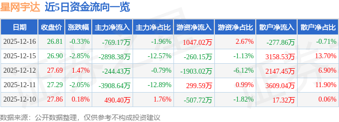 证券之星消息,截至2025年12月16日收盘,星网宇达(002829)报收于26.81元,下跌0.33%,换手率10.18%,成交量14.87万手,成交额3.92亿元。