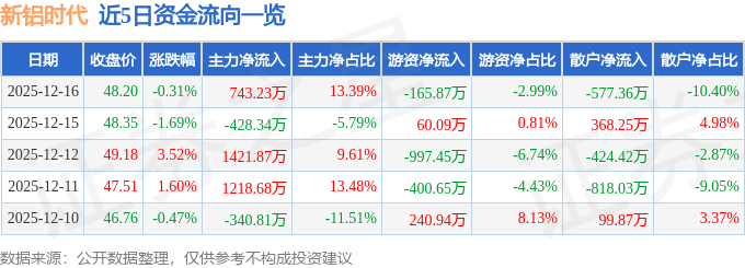证券之星消息,截至2025年12月16日收盘,新铝时代(301613)报收于48.2元,下跌0.31%,换手率1.37%,成交量1.15万手,成交额5551.47万元。