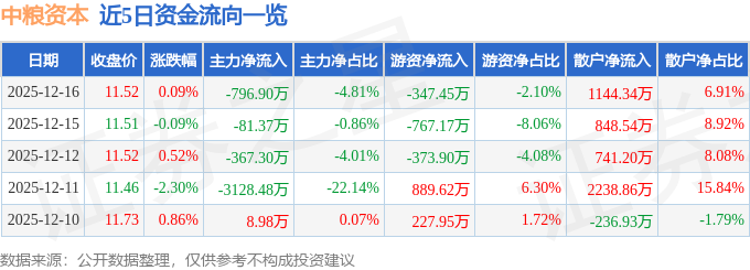 证券之星消息,截至2025年12月16日收盘,中粮资本(002423)报收于11.52元,上涨0.09%,换手率0.63%,成交量14.5万手,成交额1.66亿元。