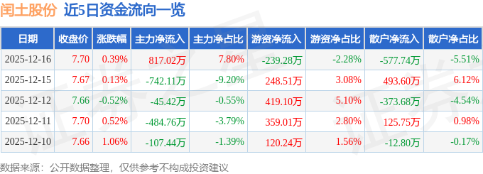 证券之星消息,截至2025年12月16日收盘,闰土股份(002440)报收于7.7元,上涨0.39%,换手率1.44%,成交量13.64万手,成交额1.05亿元。