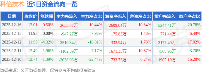 证券之星消息,截至2025年12月16日收盘,科信技术(300565)报收于12.01元,上涨0.5%,换手率9.15%,成交量20.88万手,成交额2.52亿元。