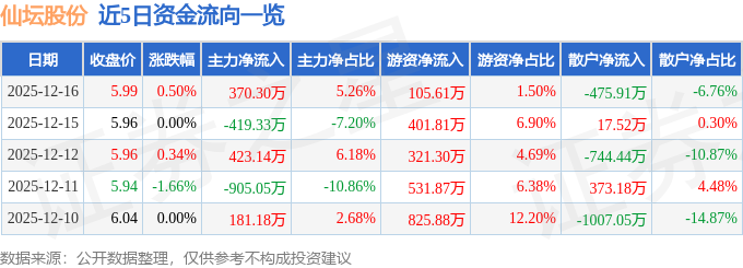 证券之星消息,截至2025年12月16日收盘,仙坛股份(002746)报收于5.99元,上涨0.5%,换手率1.66%,成交量11.78万手,成交额7039.45万元。