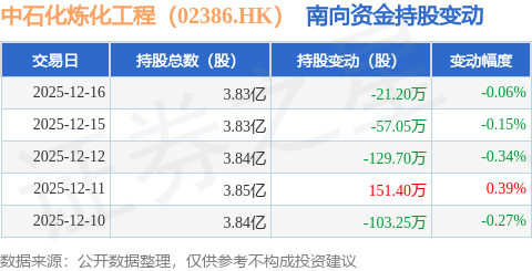 证券之星消息,12月16日南向资金减持21.2万股中石化炼化工程(02386.HK)。近5个交易日中,获南向资金减持的有4天,累计净减持159.8万股。近20个交易日中,获南向资金减持的有10天,累计净减持29.45万股。截至目前,南向资金持有中石化炼化工程(02386.HK)3.83亿股,占公司已发行普通股的26.84%。