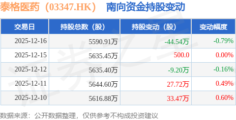 证券之星消息,12月16日南向资金减持44.54万股泰格医药(03347.HK)。近5个交易日中,获南向资金增持的有3天,累计净增持7.5万股。近20个交易日中,获南向资金减持的有10天,累计净减持217.93万股。截至目前,南向资金持有泰格医药(03347.HK)5590.91万股,占公司已发行普通股的45.4%。