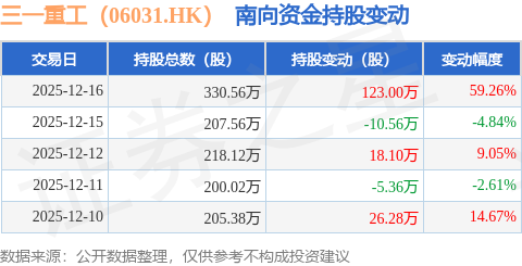 证券之星消息,12月16日南向资金增持123.0万股三一重工(06031.HK)。近5个交易日中,获南向资金增持的有3天,累计净增持151.46万股。截至目前,南向资金持有三一重工(06031.HK)330.56万股,占公司已发行普通股的0.45%。