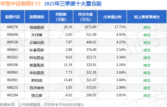华宝中证制药ETF基金成立于2025年6月11日,基金经理为张放,基金跟踪标的为中证制药指数,成立以来超额回报为3.17%,近一个月超额回报为0.07%。最新披露的基金持仓数据显示,截止2025年9月30日,该基金第一大重仓股为恒瑞医药(600276),持股占比为17.71%。