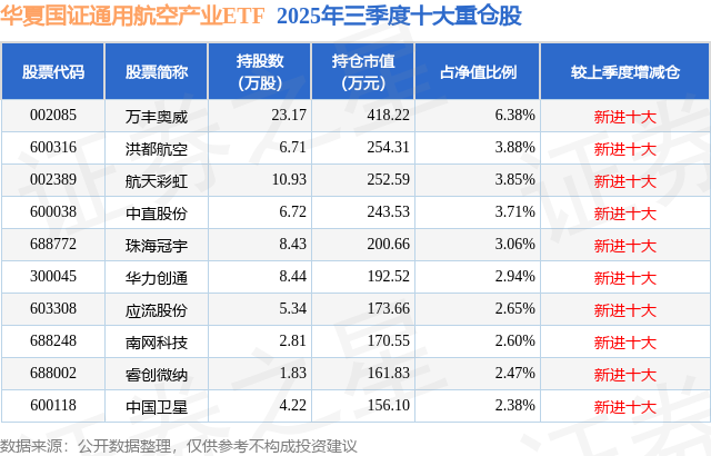 华夏国证通用航空产业ETF基金成立于2025年5月21日,基金经理为杨斯琪,基金跟踪标的为国证通用航空产业指数,成立以来超额回报为0.67%,近一个月超额回报为-0.09%。最新披露的基金持仓数据显示,截止2025年9月30日,该基金第一大重仓股为万丰奥威(002085),持股占比为6.38%。