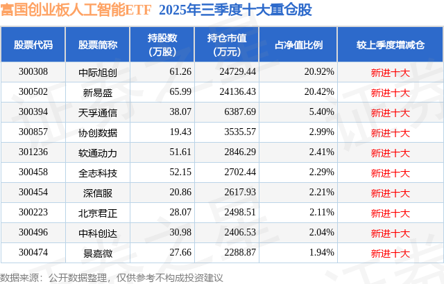 富国创业板人工智能ETF基金成立于2025年7月2日,基金经理为殷钦怡,基金跟踪标的为创业板人工智能指数,成立以来超额回报为-0.37%,近一个月超额回报为-0.06%。最新披露的基金持仓数据显示,截止2025年9月30日,该基金第一大重仓股为中际旭创(300308),持股占比为20.92%。