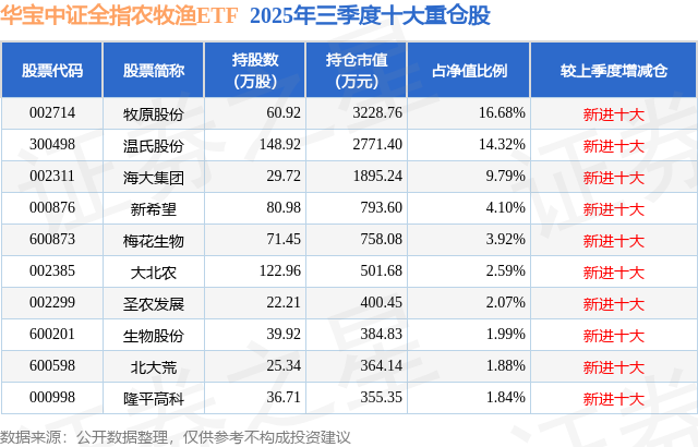 华宝中证全指农牧渔ETF基金成立于2025年9月19日,基金经理为陈建华,基金跟踪标的为中证全指农牧渔指数,成立以来超额回报为2.48%,近一个月超额回报为0.57%。最新披露的基金持仓数据显示,截止2025年9月30日,该基金第一大重仓股为牧原股份(002714),持股占比为16.68%。