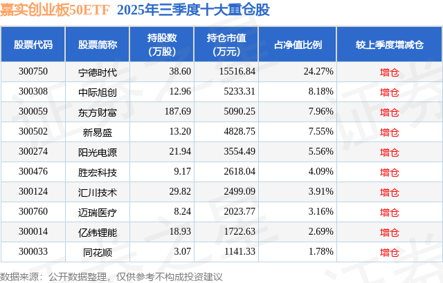 嘉实创业板50ETF基金成立于2025年1月23日,基金经理为张超梁,基金跟踪标的为创业板50指数,成立以来超额回报为1.81%,近一个月超额回报为0.08%。最新披露的基金持仓数据显示,截止2025年9月30日,该基金第一大重仓股为宁德时代(300750),持股占比为24.27%。
