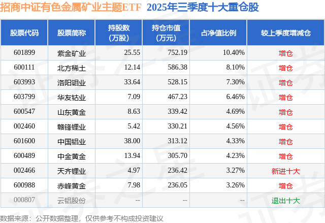 招商中证有色金属矿业主题ETF基金成立于2023年6月21日,基金经理为邓童,基金跟踪标的为中证有色金属矿业主题指数,成立以来超额回报为6.8%,近一个月超额回报为0.06%。最新披露的基金持仓数据显示,截止2025年9月30日,该基金第一大重仓股为紫金矿业(601899),持股占比为10.4%。