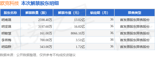 证券之星消息,根据市场公开信息整理,欧克科技(001223)于12月17日将有7000.0万股限售股份解禁,为公司首发原股东限售股份,占公司总股本74.99%。(本次数据根据历史公告整理得出,实际情况以上市公司最新公告为准)本次解禁后,公司已无限售股份。具体如下图所示: