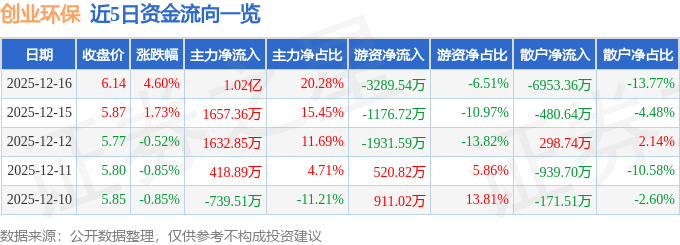 证券之星消息,截至2025年12月16日收盘,创业环保(600874)报收于6.14元,上涨4.6%,换手率6.57%,成交量80.79万手,成交额5.05亿元。
