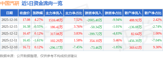 证券之星消息,截至2025年12月16日收盘,中国汽研(601965)报收于17.08元,上涨4.27%,换手率1.19%,成交量11.92万手,成交额2.02亿元。