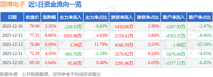 证券之星消息,截至2025年12月16日收盘,国博电子(688375)报收于79.9元,上涨3.35%,换手率1.05%,成交量6.24万手,成交额4.89亿元。
