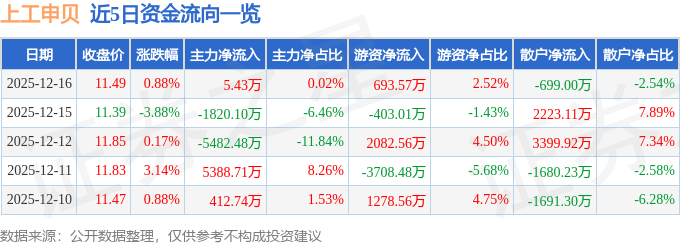 证券之星消息,截至2025年12月16日收盘,上工申贝(600843)报收于11.49元,上涨0.88%,换手率5.14%,成交量24.11万手,成交额2.76亿元。
