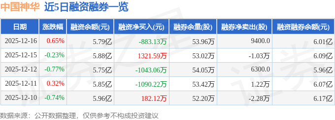 中国神华融资融券信息显示,融资方面,当日融资买入5448.09万元,融资偿还6331.22万元,融资净偿还883.13万元。融券方面,融券卖出1.53万股,融券偿还5900.0股,融券余量53.96万股,融券余额2167.57万元。融资融券余额6.01亿元。