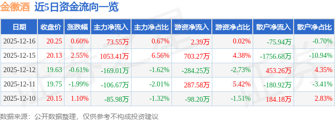 证券之星消息,截至2025年12月16日收盘,金徽酒(603919)报收于20.25元,上涨0.6%,换手率1.06%,成交量5.4万手,成交额1.09亿元。