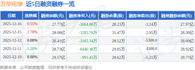 万华化学融资融券信息显示,融资方面,当日融资买入1.34亿元,融资偿还1.65亿元,融资净偿还3064.8万元。融券方面,融券卖出2.56万股,融券偿还5.8万股,融券余量28.23万股,融券余额1978.08万元。融资融券余额27.97亿元。