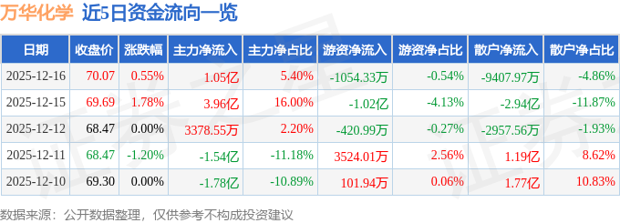 证券之星消息,截至2025年12月16日收盘,万华化学(600309)报收于70.07元,上涨0.55%,换手率0.9%,成交量28.02万手,成交额19.37亿元。