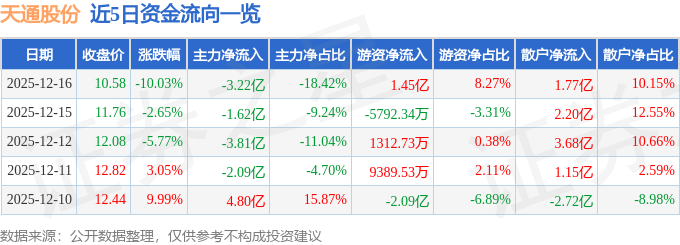 证券之星消息,截至2025年12月16日收盘,天通股份(600330)报收于10.58元,下跌10.03%,跌停,换手率13.07%,成交量161.16万手,成交额17.48亿元。