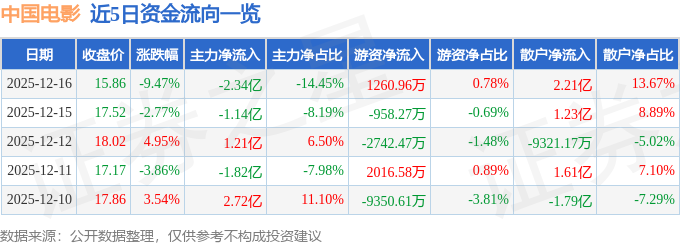 证券之星消息,截至2025年12月16日收盘,中国电影(600977)报收于15.86元,下跌9.47%,换手率5.32%,成交量99.35万手,成交额16.18亿元。