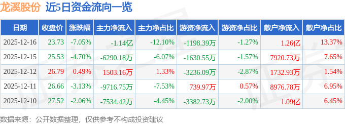 证券之星消息,截至2025年12月16日收盘,龙溪股份(600592)报收于23.73元,下跌7.05%,换手率9.76%,成交量38.99万手,成交额9.43亿元。