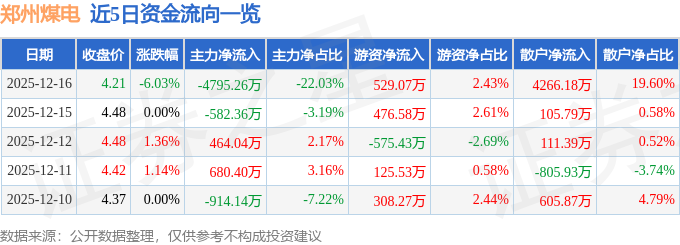 证券之星消息,截至2025年12月16日收盘,郑州煤电(600121)报收于4.21元,下跌6.03%,换手率4.17%,成交量50.78万手,成交额2.18亿元。
