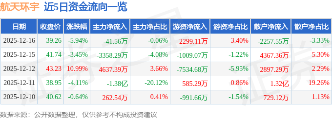 证券之星消息,截至2025年12月16日收盘,航天环宇(688523)报收于39.26元,下跌5.94%,换手率17.69%,成交量17.07万手,成交额6.77亿元。