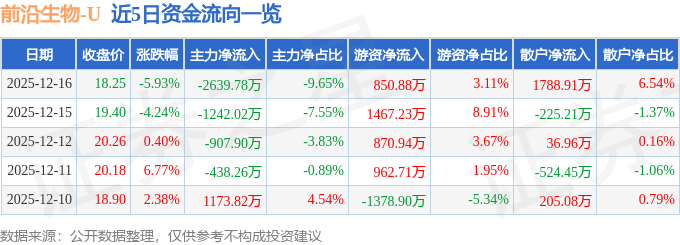 证券之星消息,截至2025年12月16日收盘,前沿生物(688221)报收于18.25元,下跌5.93%,换手率3.97%,成交量14.86万手,成交额2.74亿元。