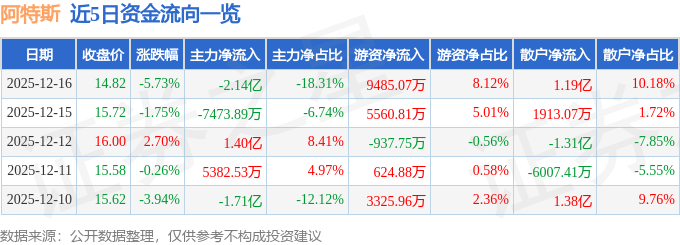 证券之星消息,截至2025年12月16日收盘,阿特斯(688472)报收于14.82元,下跌5.73%,换手率5.58%,成交量77.76万手,成交额11.68亿元。