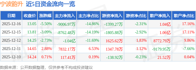 12月16日的资金流向数据方面,主力资金净流出9006.97万元,占总成交额14.86%,游资资金净流出1399.27万元,占总成交额2.31%,散户资金净流入1.04亿元,占总成交额17.16%。