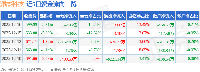 证券之星消息,截至2025年12月16日收盘,源杰科技(688498)报收于599.99元,下跌5.21%,换手率6.08%,成交量3.66万手,成交额22.22亿元。