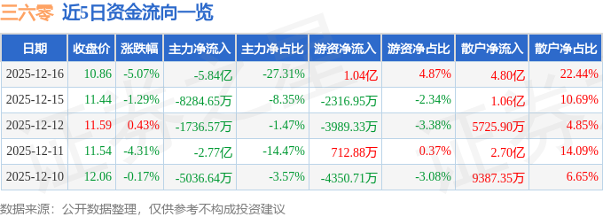 证券之星消息,截至2025年12月16日收盘,三六零(601360)报收于10.86元,下跌5.07%,换手率2.76%,成交量192.9万手,成交额21.37亿元。