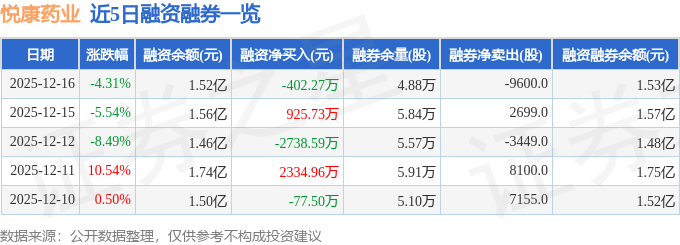 悦康药业融资融券信息显示,融资方面,当日融资买入1610.49万元,融资偿还2012.76万元,融资净偿还402.27万元。融券方面,融券卖出0.0股,融券偿还9600.0股,融券余量4.88万股,融券余额108.23万元。融资融券余额1.53亿元。