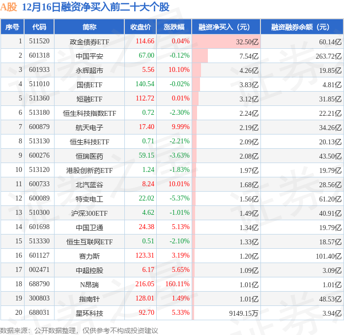 A股融资净买入前三分别为:政金债券ETF(511520)融资净买入32.5亿元、中国平安(601318)融资净买入7.54亿元、永辉超市(601933)融资净买入4.26亿元,前20具体见下表: