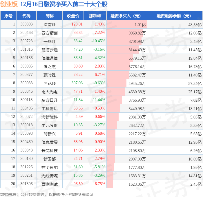 创业板融资净买入前三分别为:指南针(300803)融资净买入1.01亿元、四方精创(300468)融资净买入9060.82万元、一品红(300723)融资净买入8701.98万元,前20具体见下表: