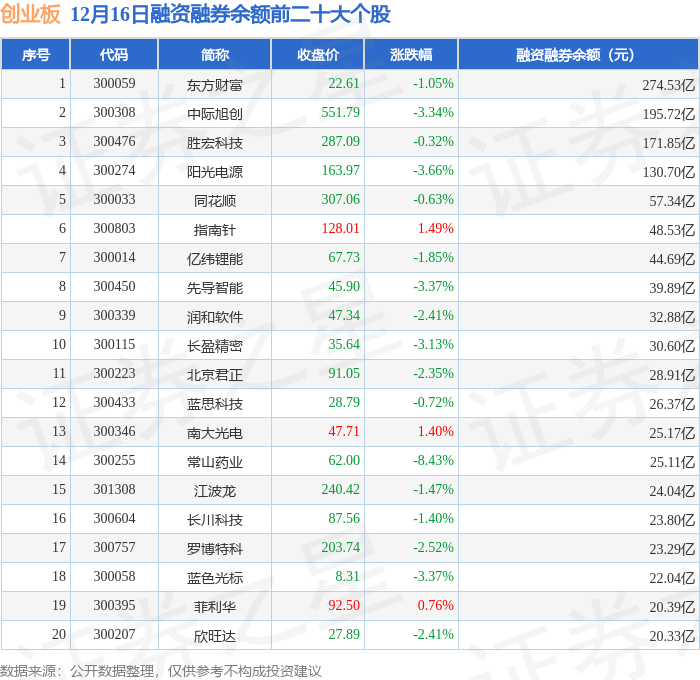 创业板融资融券余额前三分别为:东方财富(300059)融资融券余额274.53亿元、中际旭创(300308)融资融券余额195.72亿元、胜宏科技(300476)融资融券余额171.85亿元,前20具体见下表: