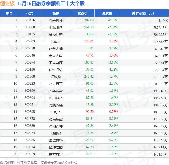 创业板融券余额前三分别为:胜宏科技(300476)融券余额1.19亿元、中际旭创(300308)融券余额5872.15万元、长盈精密(300115)融券余额3049.35万元,前20具体见下表: