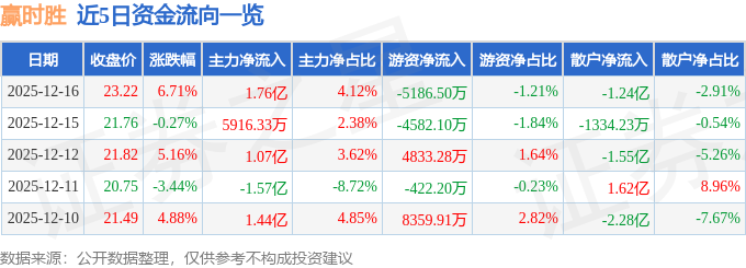 证券之星消息,截至2025年12月16日收盘,赢时胜(300377)报收于23.22元,上涨6.71%,换手率26.85%,成交量185.5万手,成交额42.75亿元。