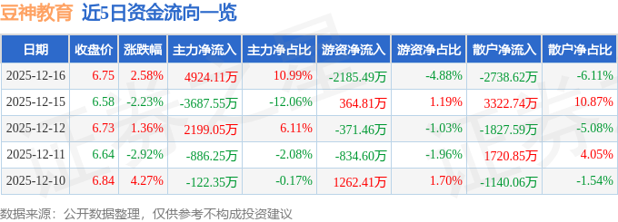 证券之星消息,截至2025年12月16日收盘,豆神教育(300010)报收于6.75元,上涨2.58%,换手率4.03%,成交量67.01万手,成交额4.48亿元。