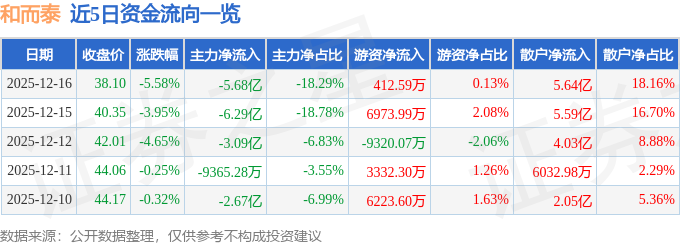 证券之星消息,截至2025年12月16日收盘,和而泰(002402)报收于38.1元,下跌5.58%,换手率9.96%,成交量80.25万手,成交额31.05亿元。