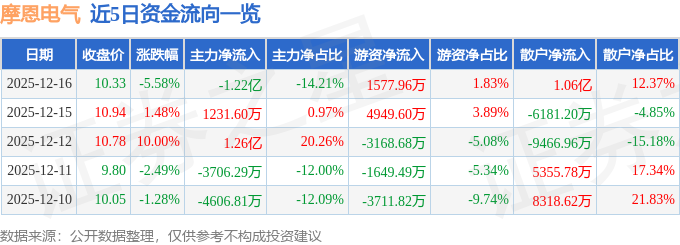 证券之星消息,截至2025年12月16日收盘,摩恩电气(002451)报收于10.33元,下跌5.58%,换手率18.54%,成交量81.43万手,成交额8.6亿元。