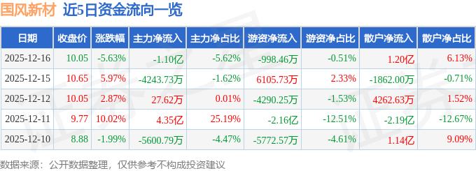 证券之星消息,截至2025年12月16日收盘,国风新材(000859)报收于10.05元,下跌5.63%,换手率21.5%,成交量192.67万手,成交额19.6亿元。
