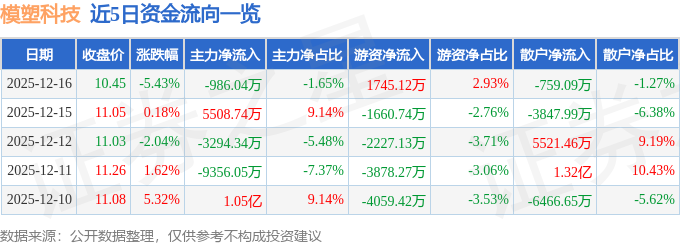 证券之星消息,截至2025年12月16日收盘,模塑科技(000700)报收于10.45元,下跌5.43%,换手率6.09%,成交量55.93万手,成交额5.96亿元。