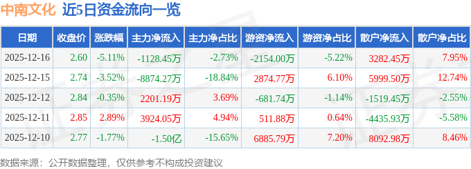 证券之星消息,截至2025年12月16日收盘,中南文化(002445)报收于2.6元,下跌5.11%,换手率6.63%,成交量156.9万手,成交额4.13亿元。